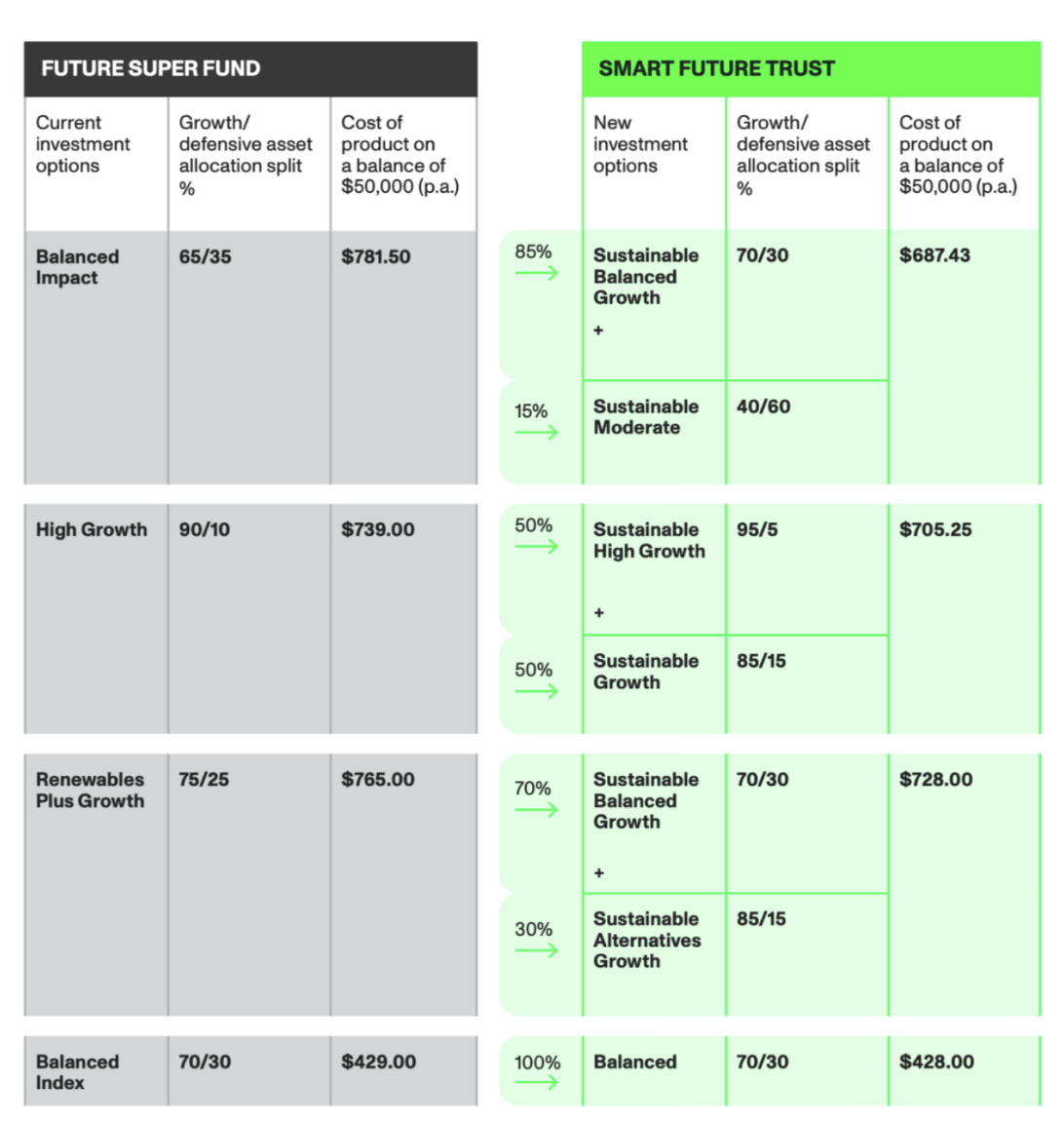In May 2025, the investment structure was updated with a move to the Smart Future Trust and and the introduction of five new investment options. Previous options were closed, and existing members were moved to comparable options aligned to their risk profile. It’s the investment structure that’s new, not the company or our commitment to sustainable investing, our values and screening approach remain the same.